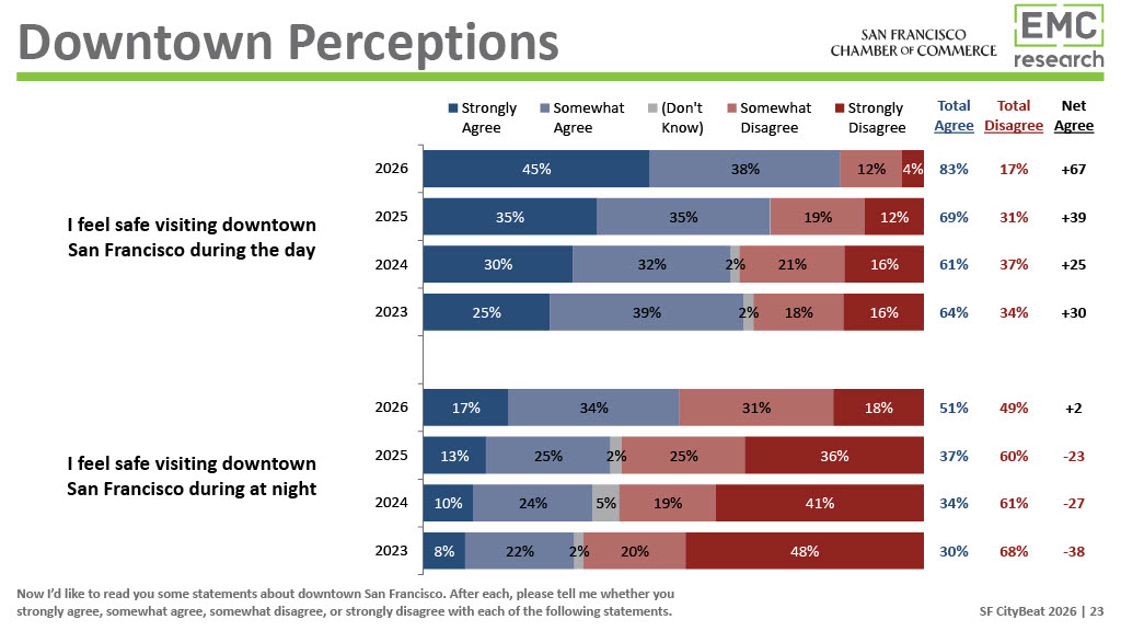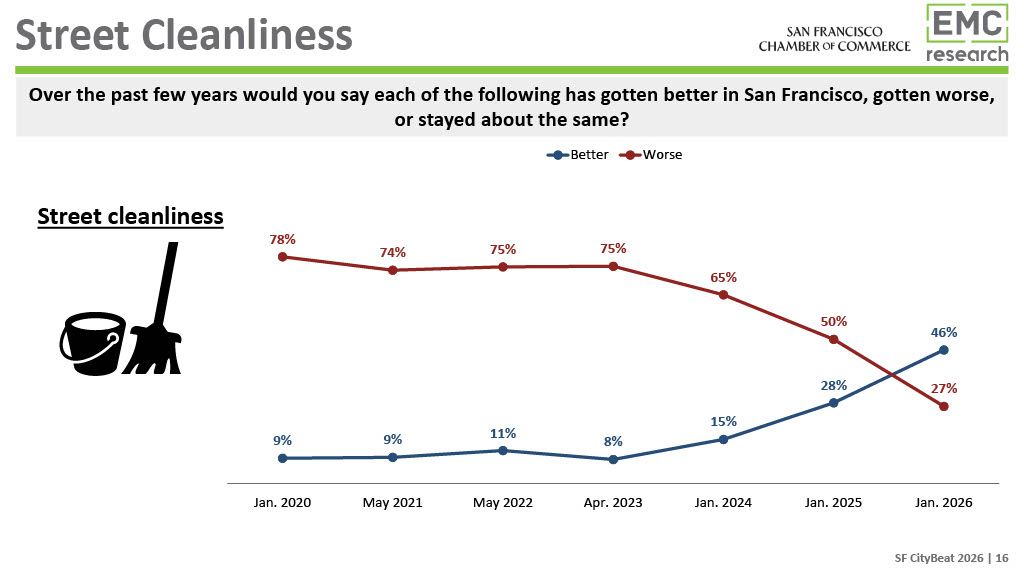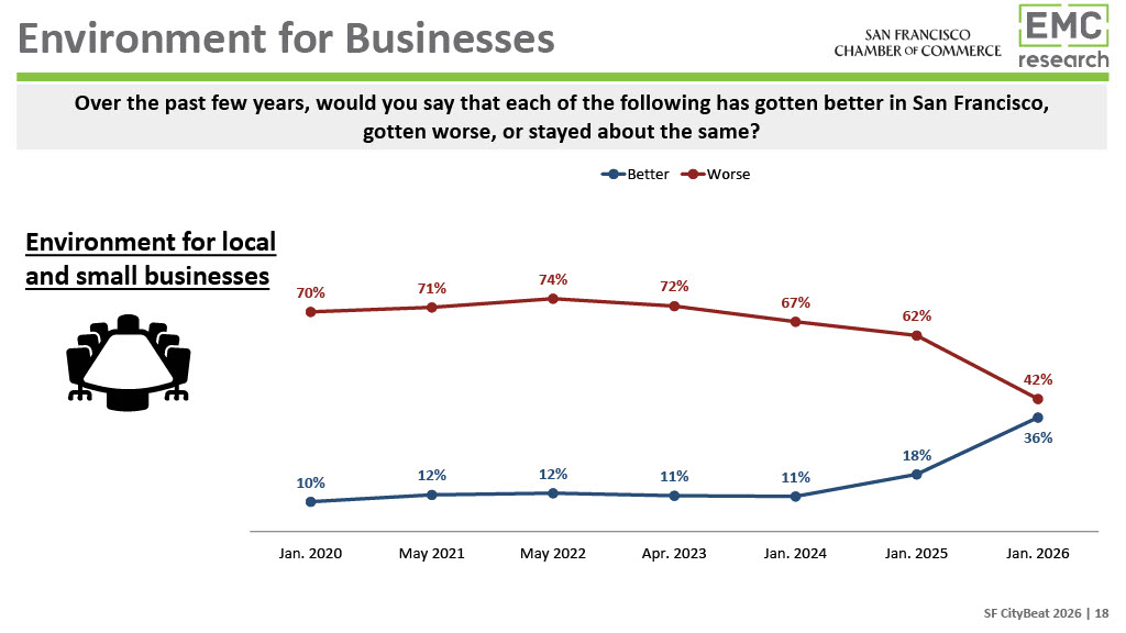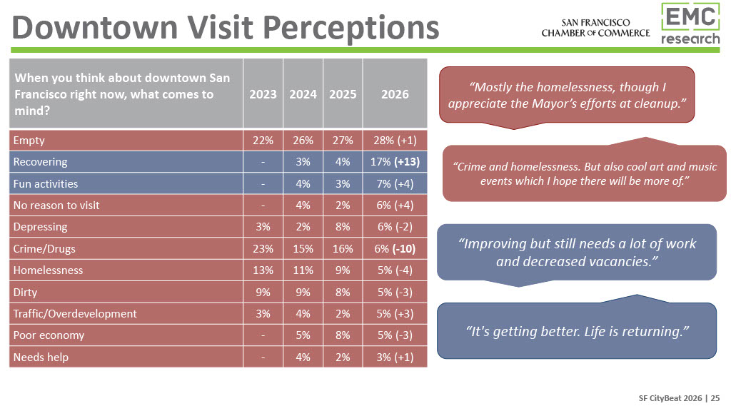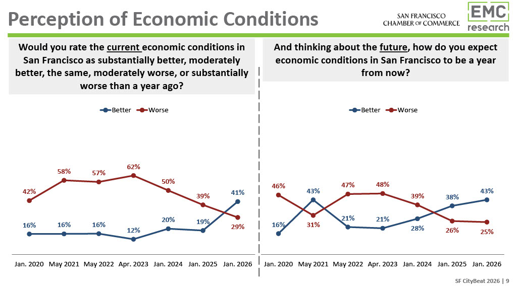 The 2026 CityBeat Poll, presented by United Airlines, was conducted by EMC Research and surveyed 500 San Francisco voters in January 2026. Additional findings and a video presenting them will be made available on the San Francisco Chamber of Commerce website.
